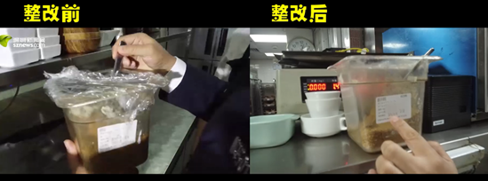4月19日記者回訪發(fā)現(xiàn)該餐廳負責人整改態(tài)度積極,針對檢查中指出的問題進行了逐項整改,包括:后廚外專門騰出一個空間擺放食材及工具,不再占用廚房區(qū)域;生熟食已做到分開放置;倉庫擺放整齊有序;消毒柜溫度已可以達到90度以上;新設(shè)置一個粗加工區(qū)與烹調(diào)區(qū)隔離開;被查封的涼菜間重新進行了問題排查與改善。經(jīng)過轄區(qū)食藥監(jiān)管部門的復評后目前該餐廳的餐飲量化等級已恢復至B級。該餐廳負責人也向記者表示,“星期三查餐廳”不僅是檢查,還給予他們對后廚管理的手把手的指導,提升很大,后續(xù)將繼續(xù)加強后廚管理,給消費者一個安全健康的就餐環(huán)境保障。