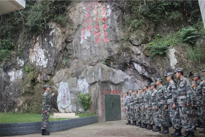 巖石旁,南部戰(zhàn)區(qū)陸軍某邊防旅“鋼七連”升起的國旗迎風招展,與鮮紅的大字交相輝映。戰(zhàn)壕軍史館就坐落于此處。