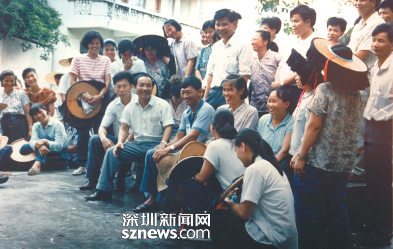 上個(gè)世紀(jì)八十年代,南嶺村老書(shū)記張偉基(中)與黨員群眾在談心