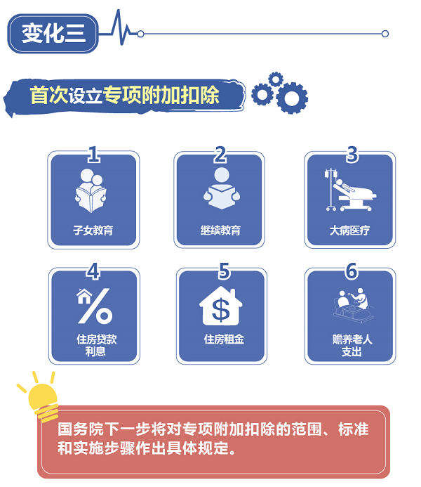 此次個稅改革還首次設立專項附加扣除,這是改革的突出亮點,圍繞與群眾生活密切相關的支出領域,在現(xiàn)行稅法基本養(yǎng)老、醫(yī)療、失業(yè)保險金和住房公積金稅前扣除的基礎上,額外增加子女教育、繼續(xù)教育、大病醫(yī)療、住房貸款利息或住房租金、贍養(yǎng)老人等6項專項附加扣除,將進一步增強稅制的公平合理性。根據(jù)稅法授權,國務院下一步將對專項附加扣除的范圍、標準和實施步驟作出具體規(guī)定。