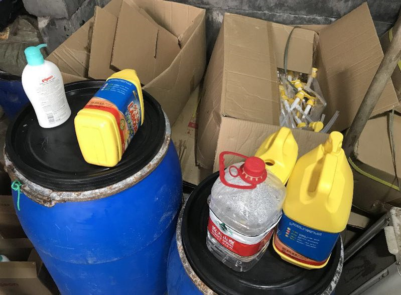 經(jīng)過執(zhí)法人員檢查,發(fā)現(xiàn)現(xiàn)場(chǎng)有疑似用來制作洗潔精、消毒液等的原料和工具,現(xiàn)場(chǎng)一些箱子中還有未灌裝的空罐子以及一些待貼標(biāo)簽。據(jù)了解,當(dāng)事人從外面以低廉價(jià)格買來比較劣質(zhì)、不知名的原料,通過簡(jiǎn)單勾兌,再分裝成知名品牌日化用品。