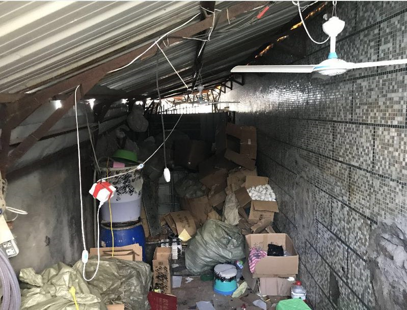 執(zhí)法人員來到位于龍東社區(qū)同昌路的一個(gè)工業(yè)區(qū)進(jìn)行突擊檢查。剛進(jìn)入該工業(yè)區(qū),執(zhí)法人員就發(fā)現(xiàn)有幾間鐵皮房大門緊鎖,通過門縫還能看到大量各品牌的洗衣粉、消毒液,以及各式設(shè)備數(shù)臺(tái)。經(jīng)檢查,現(xiàn)場(chǎng)共有這類鐵皮房3個(gè),分散在工業(yè)園區(qū)3個(gè)不起眼的角落,占地面積超過200平方米。鐵皮房?jī)?nèi)環(huán)境惡劣、電線亂搭,地上堆滿各種標(biāo)識(shí)的加工原料以及各種日化品牌的包裝袋,數(shù)量巨大。