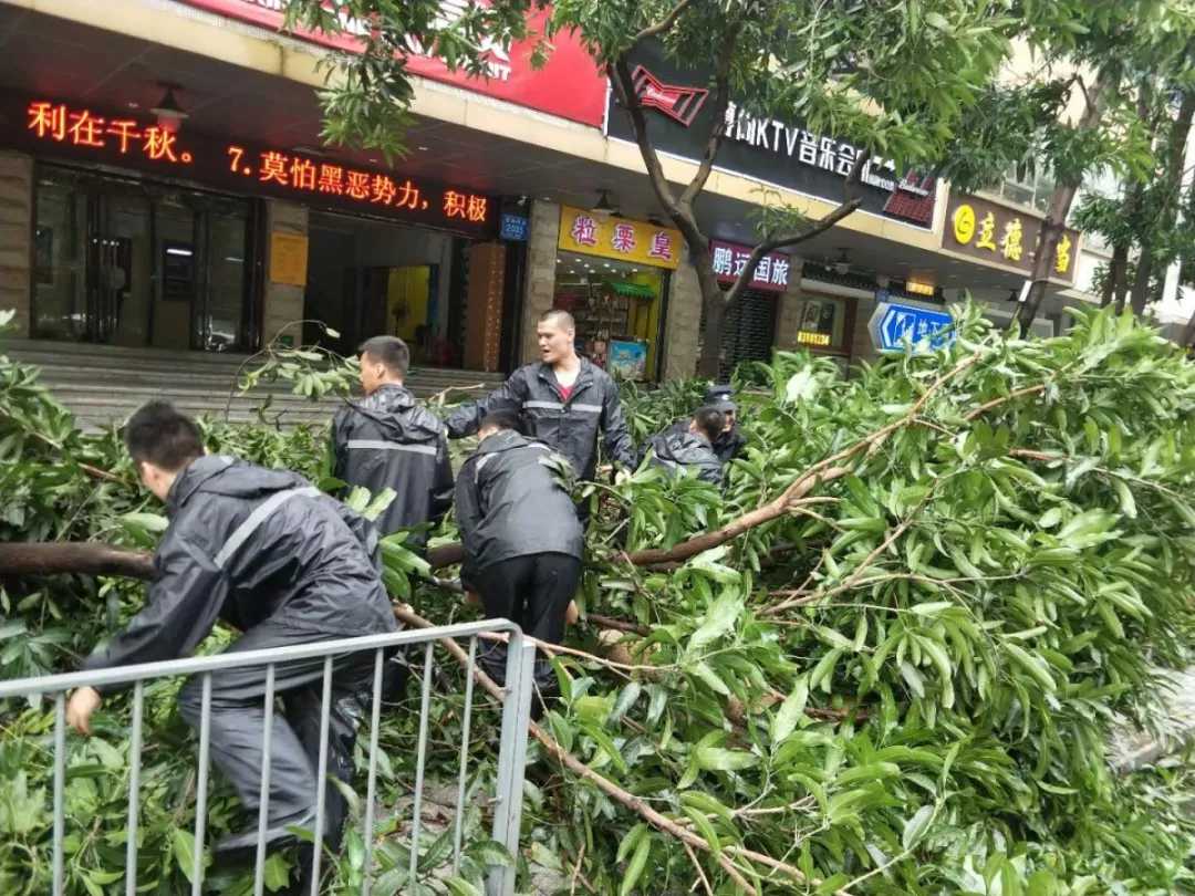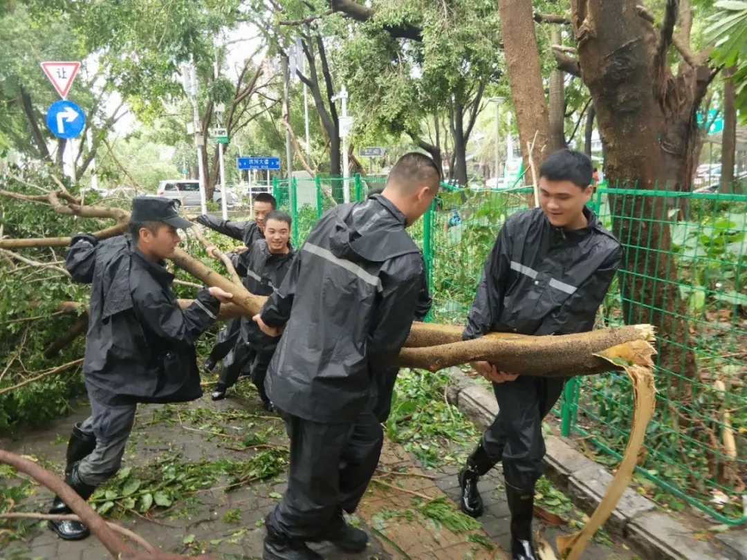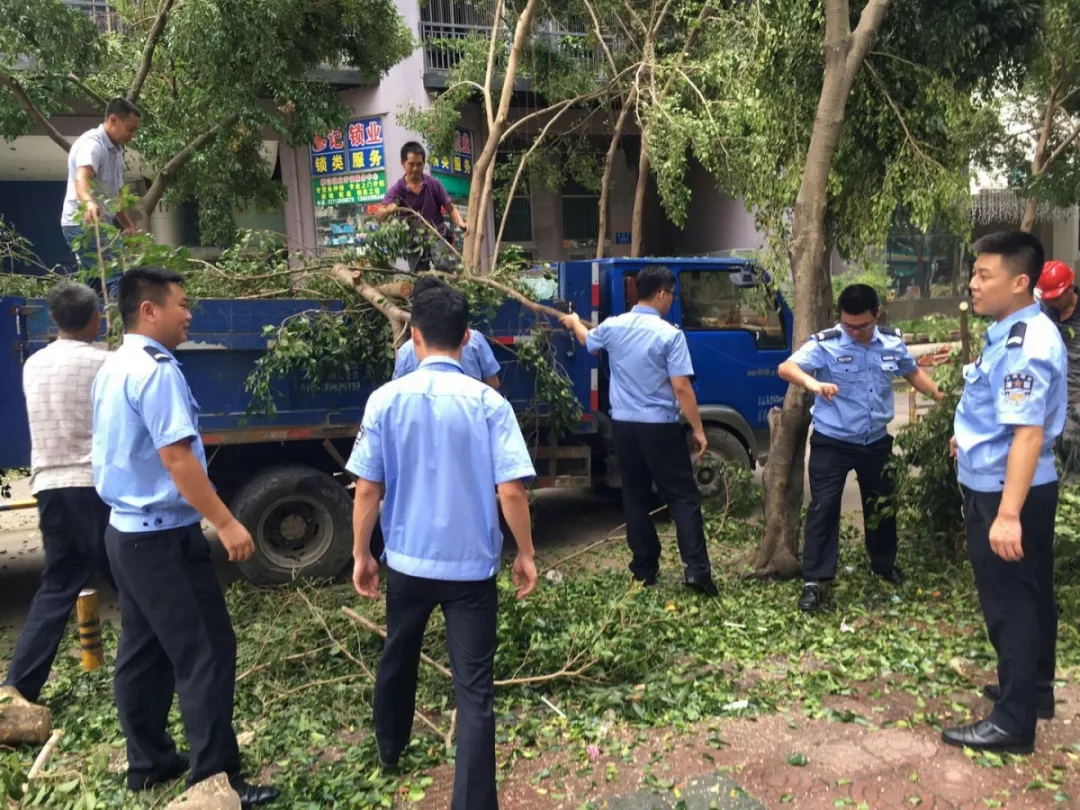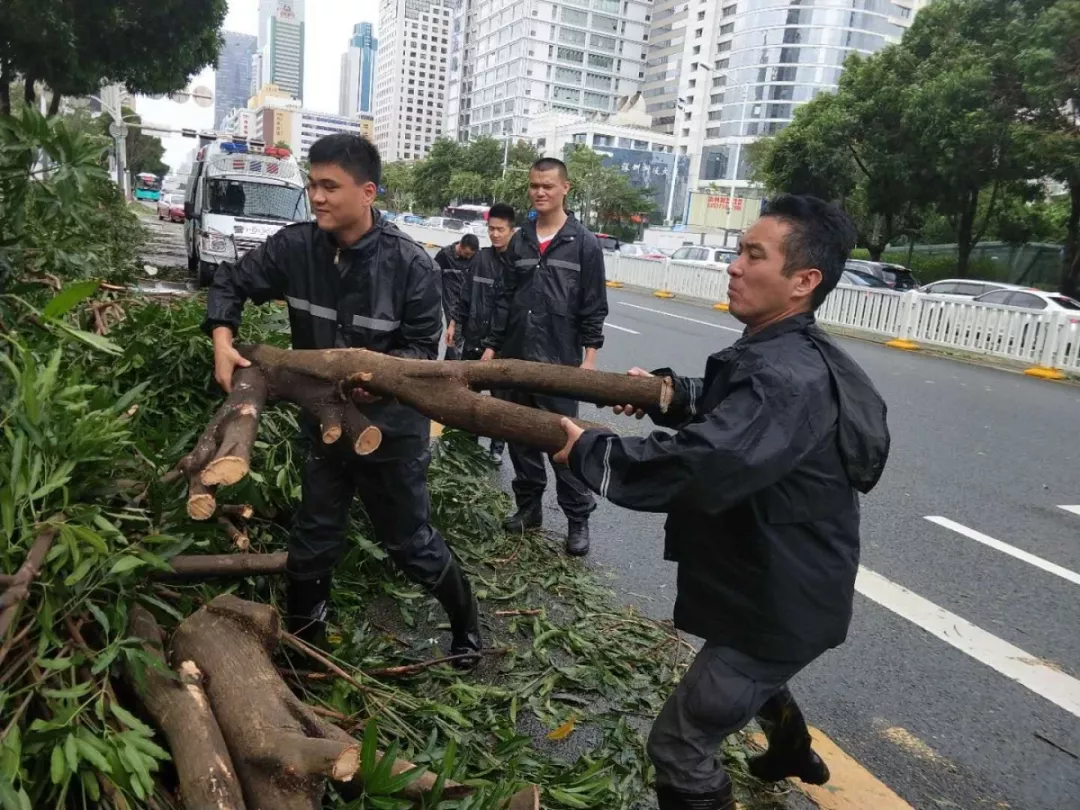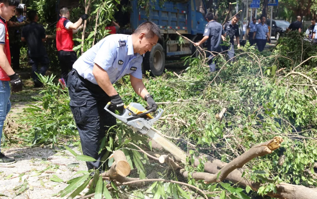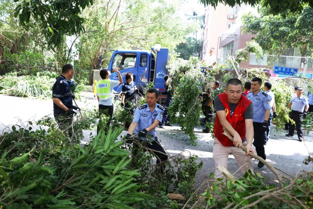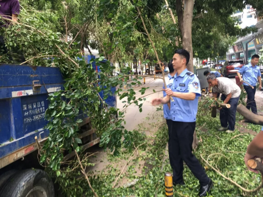 9月19日上午,福田區(qū)百花二路、三路,60多名身著藍(lán)色制服的警察和紅色馬甲的輔警格外顯眼,他們正在揮汗如雨地進行災(zāi)后路障清理工作。