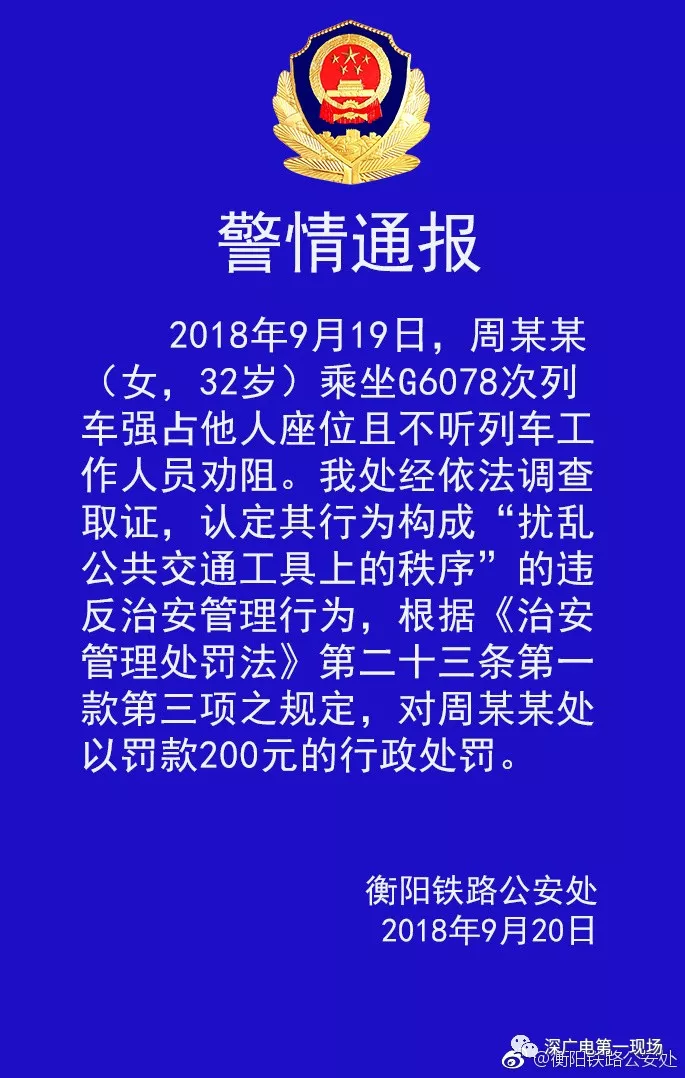 經(jīng)衡陽鐵路公安處經(jīng)依法調(diào)查取證,認(rèn)定其行為構(gòu)成“擾亂公共交通工具上的秩序”的違反治安管理行為,根據(jù)《治安管理處罰法》第二十三條第一款第三項(xiàng)之規(guī)定,對(duì)周某某處以罰款200元的行政處罰。