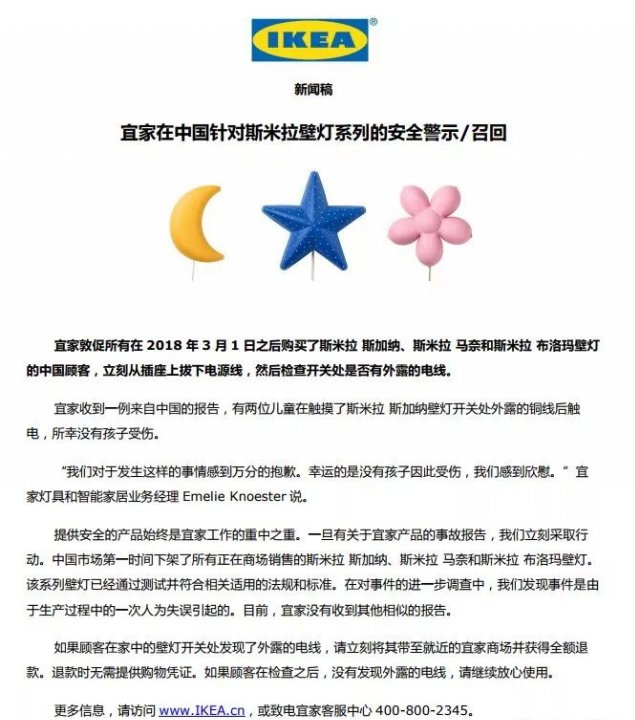 9月19日,宜家中國網(wǎng)站發(fā)布公告,宣布召回斯米拉(SMILA)系列3款兒童燈具(分別為斯加納、馬奈、布洛馬)。