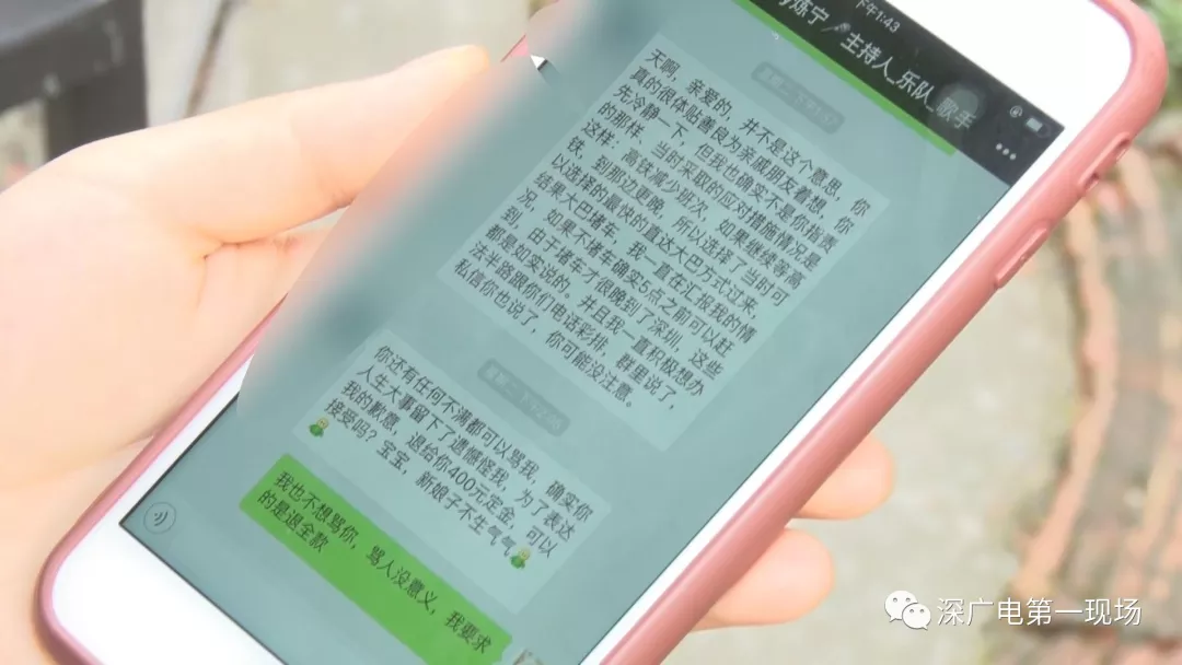 事情發(fā)生之后,李女士也多次和司儀小寧進(jìn)行溝通,要求對(duì)方退還全部訂金或者當(dāng)面賠禮道歉,一開始對(duì)方的態(tài)度還很好,并且退還了400元的定金,但最近幾天就不怎么搭理了。