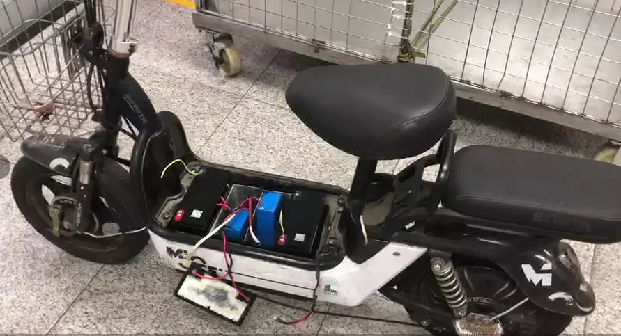 “當(dāng)時(shí)看到這名旅客電單車的腳踏板位置比車身其他位置要干凈一些、新一些,就進(jìn)行了檢查。檢查發(fā)現(xiàn)腳踏板可以直接掀起來,里面的電池盒外表也比較新,這就不太正常了。”現(xiàn)場關(guān)員介紹道。隨后,關(guān)員對電動(dòng)單車電池盒進(jìn)行了拆卸。