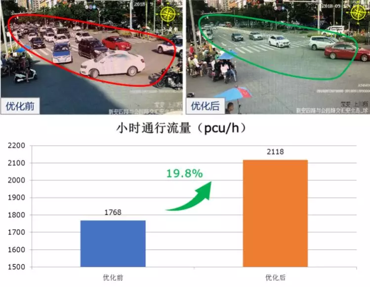 公園路為寶安中心城區(qū)主干道,為減少車車交織、改善行車秩序,9月11日,深圳交警將該路口由原先南北早起遲斷、東西對(duì)放的相位調(diào)整為北、東、南、西順時(shí)針輪放的4相位放行模式,優(yōu)化后,東西、南北行車秩序明顯改善,車車交織現(xiàn)象消失,小時(shí)通行流量由1768pcu/h提高至2118pcu/h,提升約19.8%。