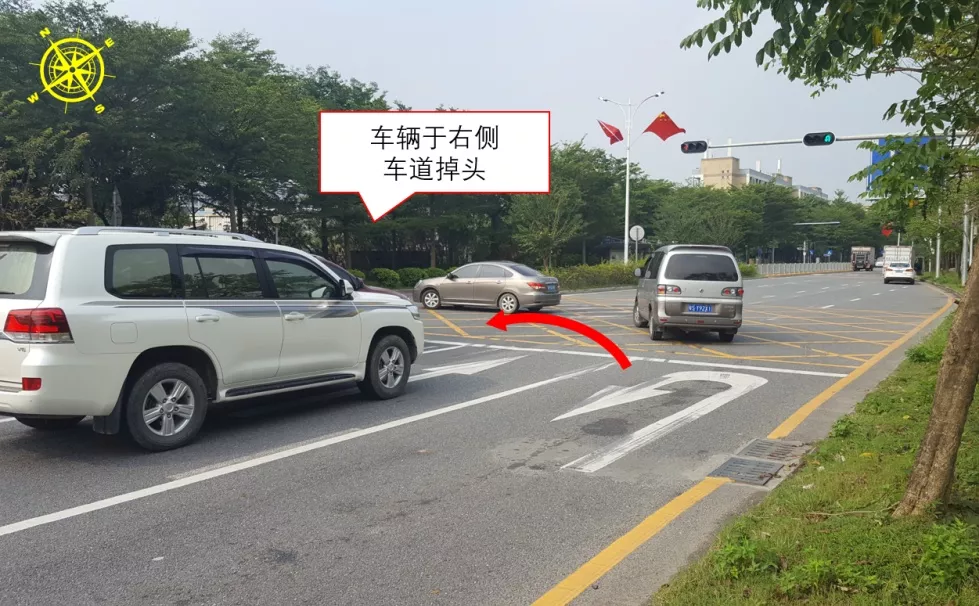 福鳳/騰豐三路口東側(cè)為鳳凰山旅游區(qū),通勤車流較多。現(xiàn)狀路口未設(shè)置紅綠燈,人車交織嚴(yán)重,交通秩序混亂,易發(fā)交通事故。9月14日,深圳交警啟用福鳳/騰豐三路口信號(hào)燈。為解決掉頭車轉(zhuǎn)彎半徑不足問(wèn)題,進(jìn)一步在距路口約96米處開設(shè)掉頭口,并以最外側(cè)車道作為掉頭車道,同時(shí)與福鳳/騰豐三路口實(shí)施聯(lián)動(dòng)設(shè)置燈控掉頭。該路口是寶安首個(gè)“一機(jī)兩控”+外側(cè)掉頭微創(chuàng)新路口。