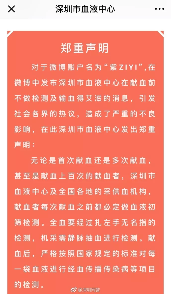 @深圳市血液中心發(fā)出鄭重聲明:無論是首次獻(xiàn)血者還是多次甚至是上百次的獻(xiàn)血者,每次獻(xiàn)血都必須做初篩檢測(cè),全血要經(jīng)過扎左手無名指的檢測(cè),機(jī)采需靜脈抽血進(jìn)行檢測(cè)。獻(xiàn)血后,嚴(yán)格按照國(guó)家規(guī)定的標(biāo)準(zhǔn)對(duì)每一袋血液進(jìn)行經(jīng)血傳播傳染病等項(xiàng)目的檢測(cè)。