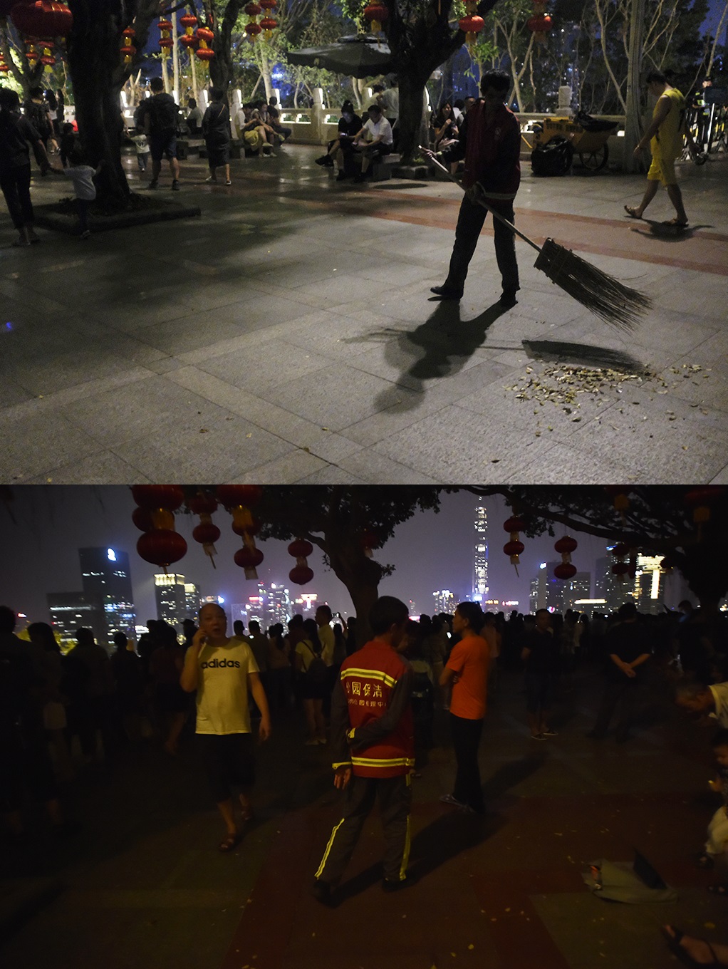 10月8日晚,蓮花山觀景臺的看燈人潮并沒有燈光秀首秀那一天洶涌,燈光表演過后,只有兩名清潔工人留下來進行垃圾清掃?!敖裢砝佟!必撠?zé)蓮花山觀景臺區(qū)域的環(huán)衛(wèi)工人告訴記者,“我們在燈光秀期間看到垃圾就會及時清理,一般散場之后一個小時是清掃時間,但今天這個工作很快就完成了,深圳人素質(zhì)還是很高的,基本很少有人會亂丟垃圾?!?/p>