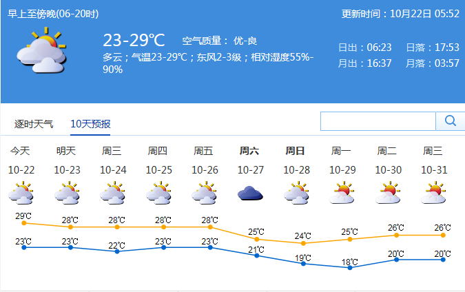 深圳新聞網(wǎng)訊 進(jìn)入10月中旬,西太平洋上的臺風(fēng)們終于“安靜”下來,冷空氣逐漸成為接下來的主角,我國北方城市也紛紛步入秋季。盡管全市在10月11日早晨全市最低氣溫普遍在20℃左右,但距真正入秋還有一定距離。據(jù)市氣象局預(yù)測,22日至26日我市大致多云,間中有小雨,最低氣溫22-24℃,最高氣溫27-29℃。