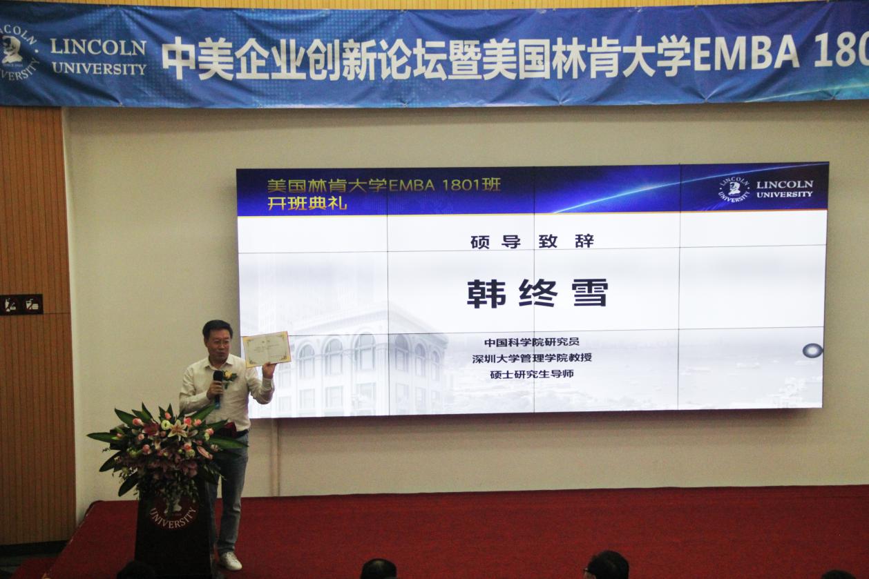 深圳新聞網(wǎng)訊 10月27日上午,由美國林肯大學EMBA深圳教學中心舉辦的《中美企業(yè)創(chuàng)新論壇》暨美國林肯大學EMBA1801班開班典禮,在深圳科技園香港科技大學報告廳舉行。論壇邀請了美國林肯大學校方代表楊崇藝博士、方勝祥先生、美國加州州立大學計算機系正教授 陶翼青 、中科院研究員韓終雪教授出席。美國林肯大學EMBA1801班的同學們、來自深圳教育行業(yè)、中國企業(yè)家代表 以及 媒體記者等160多位嘉賓 參加活動 。