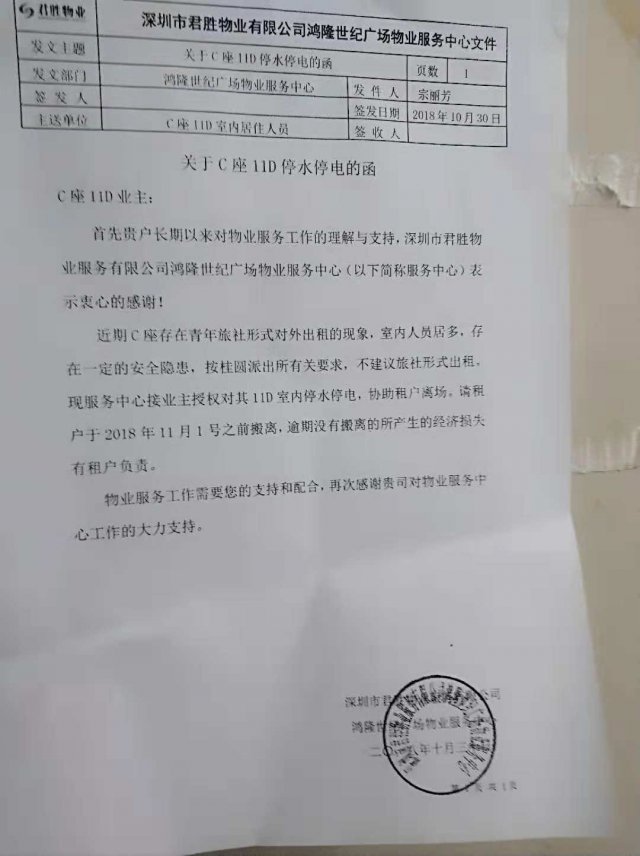 10月30日鴻隆世紀(jì)廣場(chǎng)物業(yè)服務(wù)中心物業(yè)發(fā)出關(guān)于 C座11D停水停電函,表示 C座存在青年旅社形式對(duì)外出租的現(xiàn)象,室內(nèi)人員居多,存在安全隱患,按桂園派出所有關(guān)要求,不建議旅社形式出租。業(yè)主授權(quán)物業(yè)中心對(duì)11D進(jìn)行室內(nèi)停水停電,協(xié)助租戶(hù)離場(chǎng),并要求租戶(hù)于11月1日之前搬離。