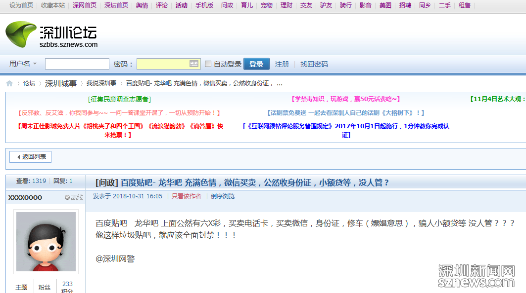 深圳新聞網11月5日訊(記者 何暢)“百度貼吧龍華吧上面充滿色情、微信買賣,公然收身份證,小額貸等,沒人管?”,近日網友在深圳論壇上曝料百度貼吧“龍華吧”內存在大量違法違規(guī)信息,引起網友廣泛關注。(網帖地址:https://szbbs.sznews.com/thread-3812582-1-1.html)