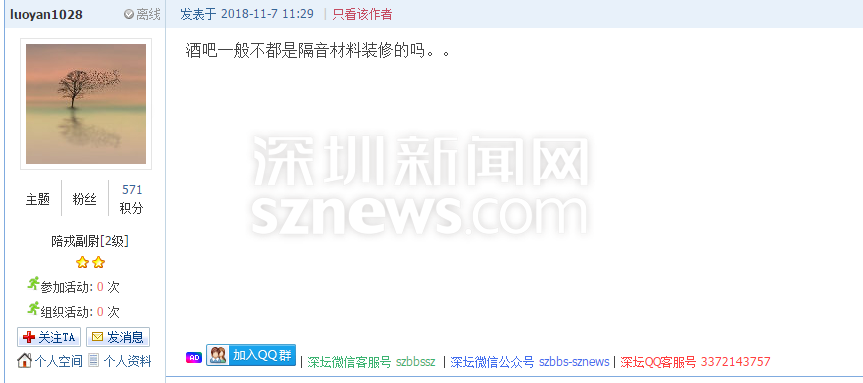 深圳新聞網(wǎng)11月7日訊(記者 施冰冰)11月6日,有網(wǎng)友在論壇爆料稱民治藍坤大廈米蘭國際酒吧每晚營業(yè)至凌晨4點,音樂聲震耳欲聾,嚴重影響了附近居民的睡眠,“逼得”該網(wǎng)友只能搬家。(網(wǎng)帖地址:https://szbbs.sznews.com/thread-3815241-1-1.html)