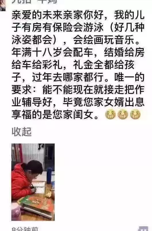 這兩天刷爆朋友圈的一種特殊的文體在朋友圈火了起來(lái),這些文章都是寫給未來(lái)的親家的,文章開(kāi)頭先是對(duì)自家娃大力夸獎(jiǎng)一番,什么有房有車、會(huì)游泳、婚禮豪配等要素,一個(gè)都不落下;文章的最后提出唯一的要求,那就是把娃現(xiàn)在就接走。這些文章充分顯示了家長(zhǎng)在輔導(dǎo)自己孩子做作業(yè)的時(shí)候,心情不太舒暢。