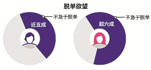 調(diào)查顯示,在脫單欲望方面,近五成單身男性和六成單身女性表示不急于改變單身狀態(tài)??梢?,單身男女的脫單欲望正在逐漸下降。