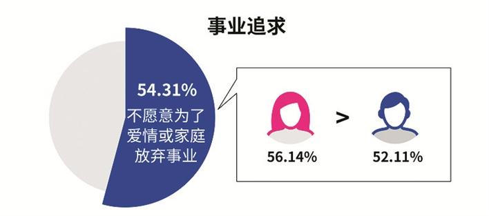 對(duì)于許多人而言,愛(ài)情和事業(yè)沖突的抉擇已經(jīng)越來(lái)越常見(jiàn)。調(diào)查顯示,54.31%的單身男女不愿意為了愛(ài)情或家庭放棄自己的事業(yè)。從男女差異看,56.14%的女性表示不愿意為了愛(ài)情或家庭放棄自己的職場(chǎng)或事業(yè),高于男性??梢?jiàn),女性對(duì)于事業(yè)的追求正在逐漸提升。