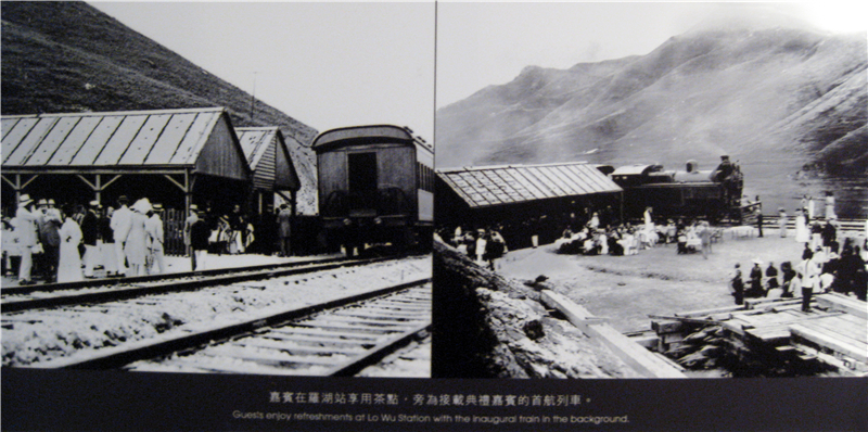 左圖為參加通車典禮的中英嘉賓在羅湖車站享用茶點(diǎn)。右圖為首航列車通過(guò)時(shí)的場(chǎng)景