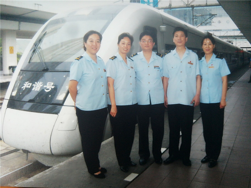 深圳火車站開(kāi)行第一趟和諧號(hào),葉迎春(右一)和同事在列車前合影