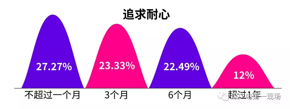 追求時間不超過一個月,23.33%的人追求時間為3個月,另外有22.49%愿意追求時間為6個月,僅有12%的單身男女追求喜歡的人愿意超過1年。