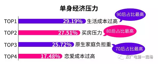 脫單難點(diǎn)中的經(jīng)濟(jì)壓力層面分析發(fā)現(xiàn),生活成本過高是影響脫單的最大單身壓力,其次是買房壓力,原生家庭負(fù)擔(dān)重以及戀愛成本過高。