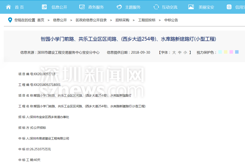 記者從寶安西鄉(xiāng)街道官網(wǎng)中標(biāo)公告獲悉,智園小學(xué)門前路工程施工中標(biāo)單位是深圳市易諾建設(shè)工程有限公司,中標(biāo)工期是40天。據(jù)招標(biāo)公告顯示計(jì)劃開(kāi)竣工時(shí)間是2018年10月08日至2018年11月18日。網(wǎng)友希望施工能夠如期完工,道路能夠早日恢復(fù)暢通,施工期間,最好能夠?qū)⑹┕?chǎng)地和人行道隔開(kāi),確保學(xué)生人身安全。
