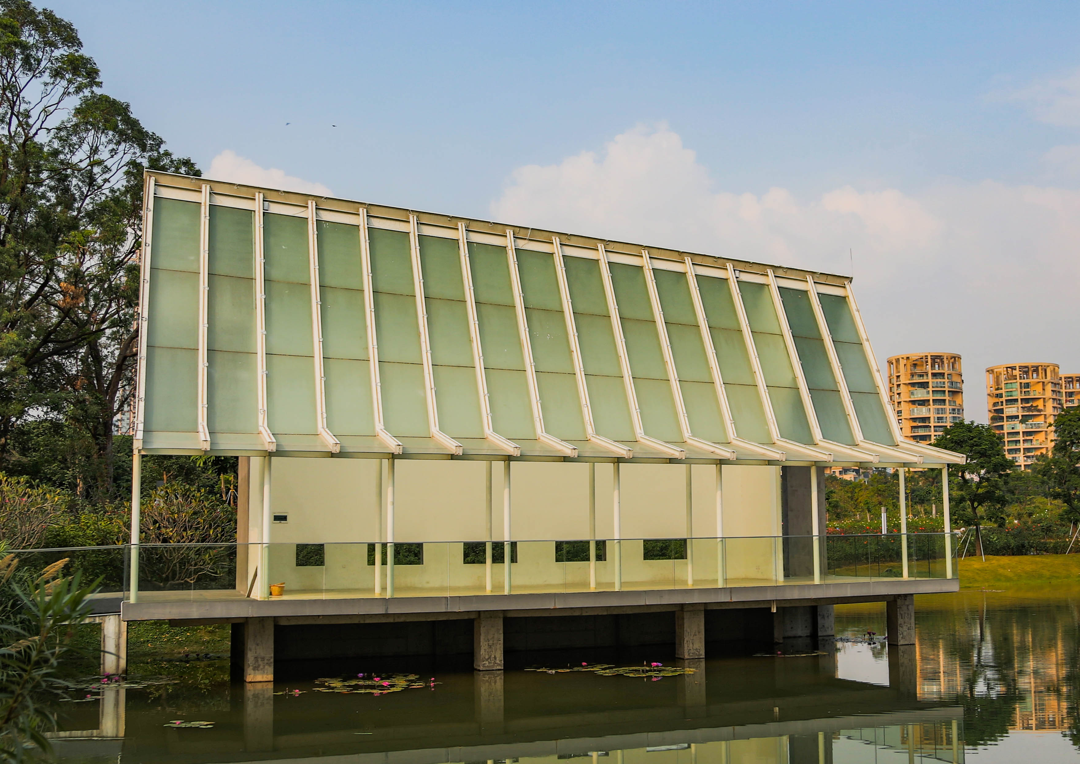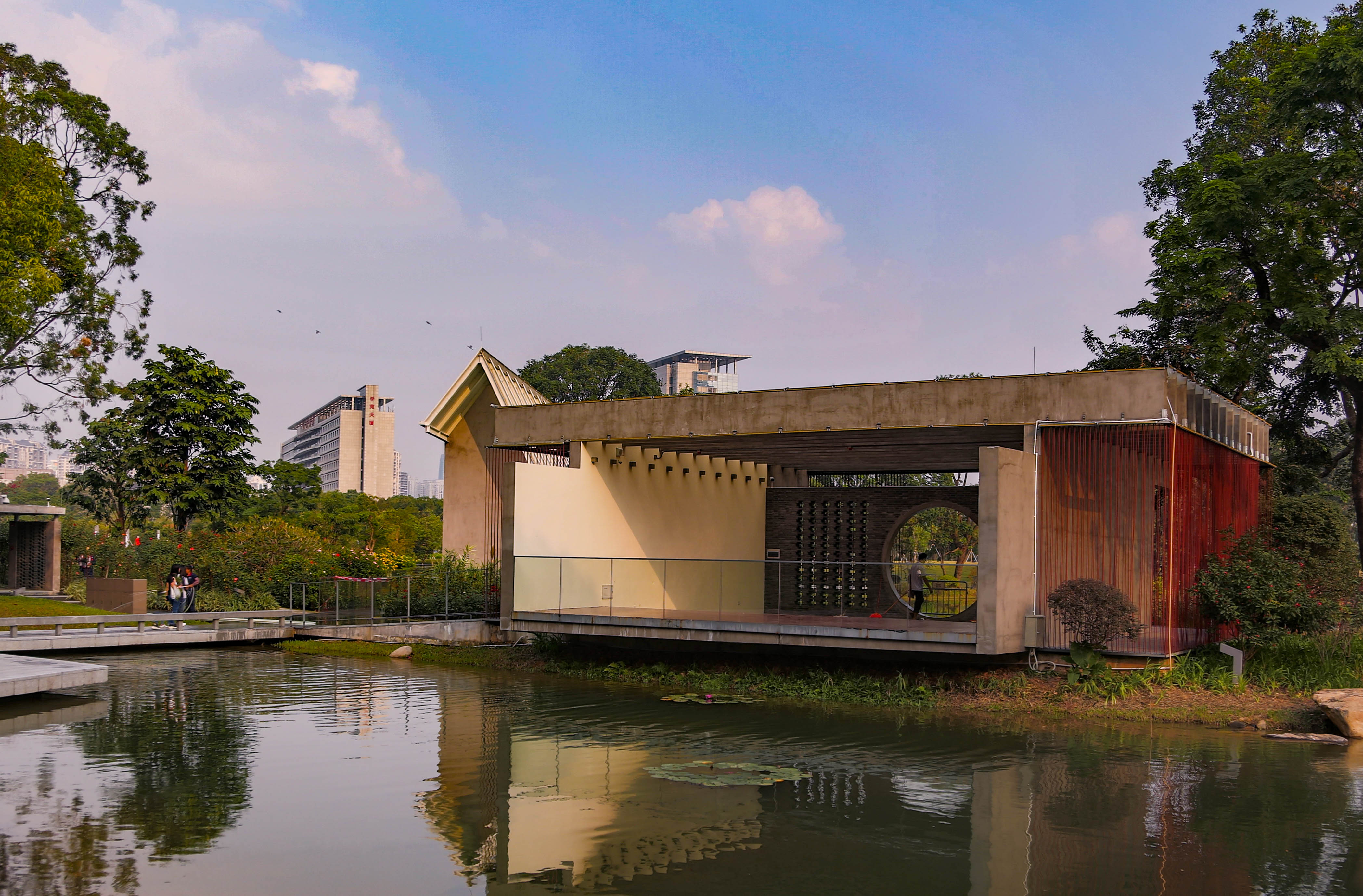 在湖對岸遠(yuǎn)望兩座風(fēng)格迥異的中西式婚姻禮堂。