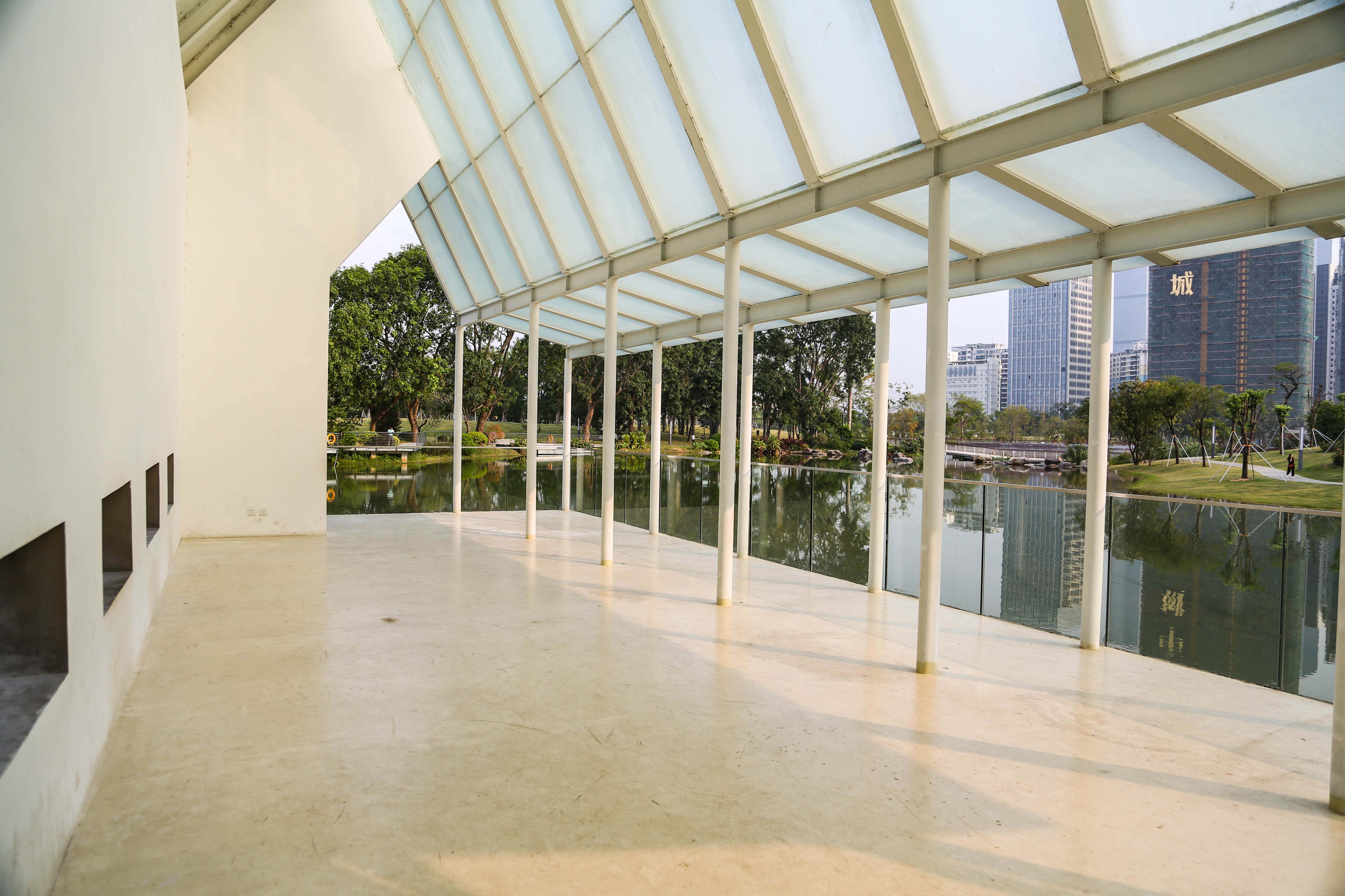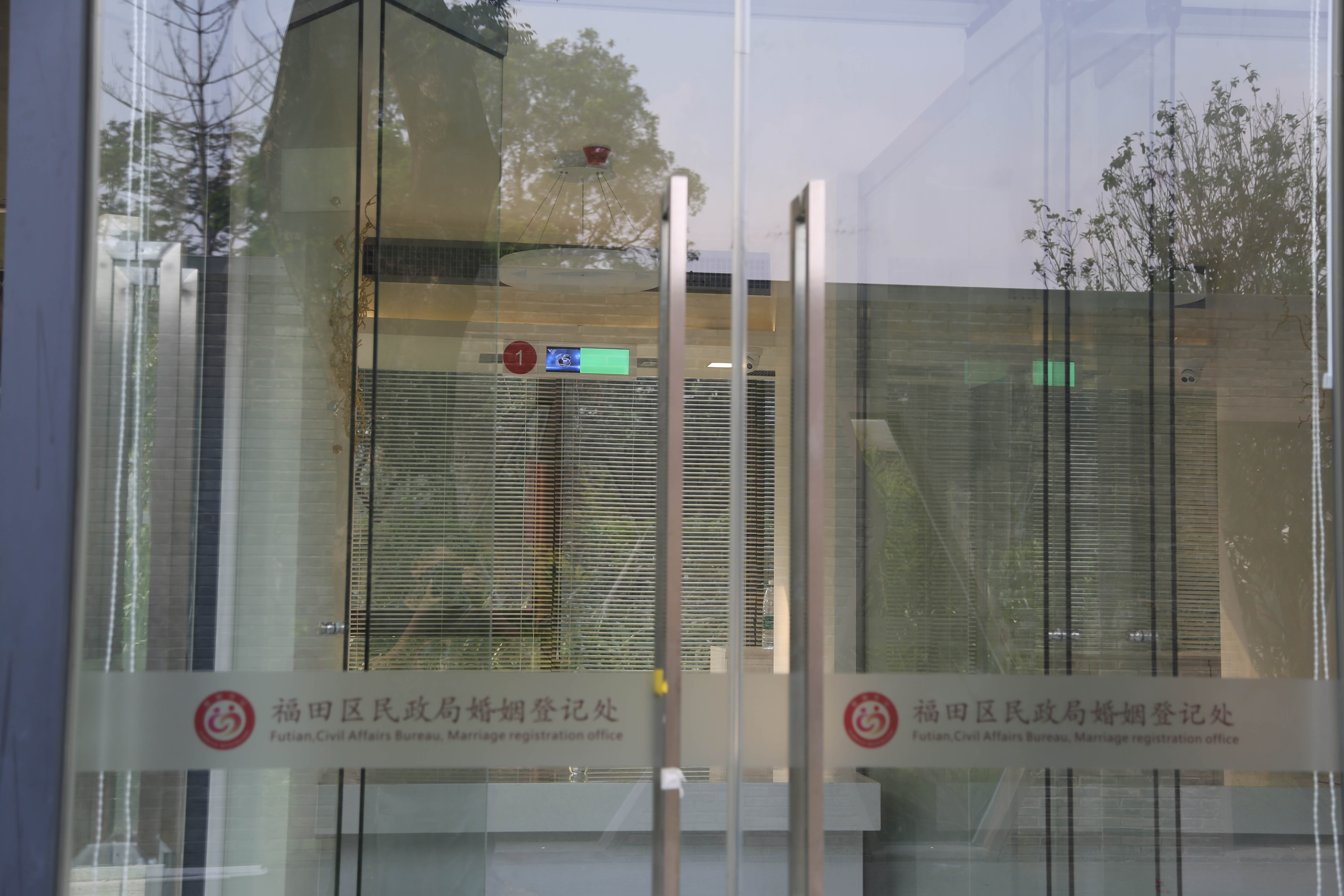 站在中式禮堂看對岸的福田區(qū)民政局婚姻登記中心叫號大廳。