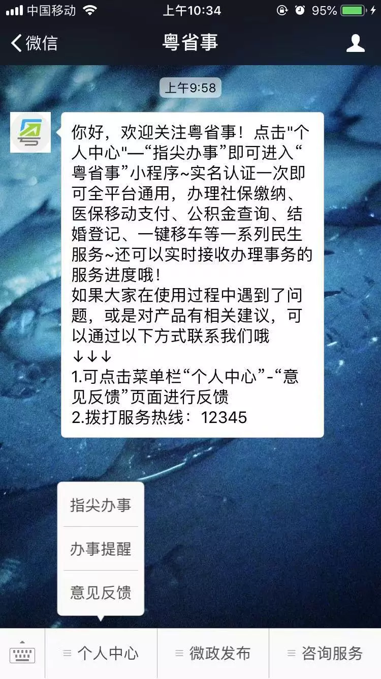 1、關(guān)注“粵省事”公眾號(hào),點(diǎn)擊菜單欄“個(gè)人中心”-“指尖辦事”