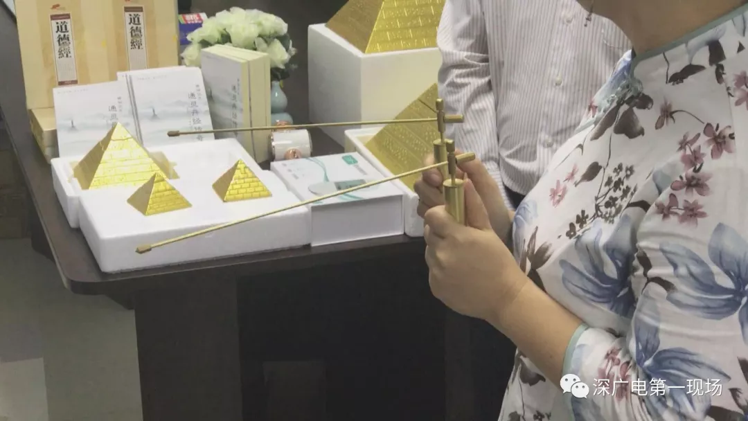 一開始,就上來(lái)了一位叫許姐的團(tuán)隊(duì)負(fù)責(zé)人,但她并沒(méi)有著急介紹主角“萬(wàn)能金字塔”,而是不慌不忙地賣弄起另一樣所謂的“神器”——尋龍尺。