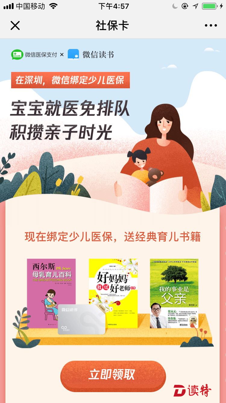 深圳特區(qū)報(bào)2018年11月21日訊 作為微信醫(yī)保支付的試點(diǎn)城市,深圳又開通便民新服務(wù),全國(guó)內(nèi)率先開通微信綁定少兒社???,支持少兒醫(yī)保線上支付服務(wù)。記者獲悉,11月20日起,父母在微信綁定孩子的少兒社???,就可以用微信上通過醫(yī)保給孩子繳納掛號(hào)、就診費(fèi)用,省去排隊(duì)煩惱。此外,20日起,用戶在微信綁定少兒社???,可免費(fèi)領(lǐng)取微信讀書三本經(jīng)典育兒書籍和3天無(wú)限閱讀卡兌換碼。