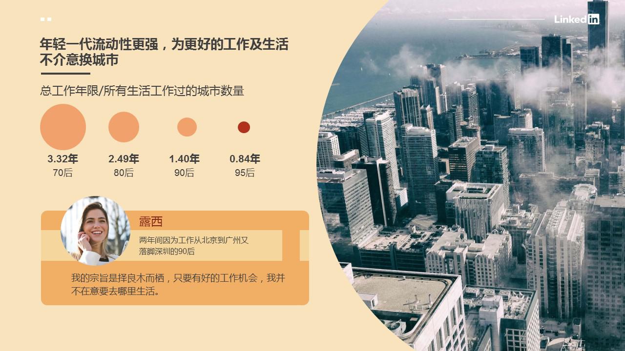 不論是因為更好的工作機會還是更理想的生活方式,新一代90/95后職場人都表現(xiàn)得更加勇敢和有魄力,“不將就”或許是他們最好的代名詞。畢業(yè)兩年間已經(jīng)經(jīng)歷從北京跳到廣州、又最終落腳深圳的90后露西表示:“不論是工作還是生活的城市,我都不會給自己太多限制,根本的原則就是擇良木而棲。現(xiàn)在許多城市對年輕人有很多利好政策,工作機會也很多,我也想多嘗試一些不同的選擇,年輕的時候就應(yīng)該多嘗試?!?/p>