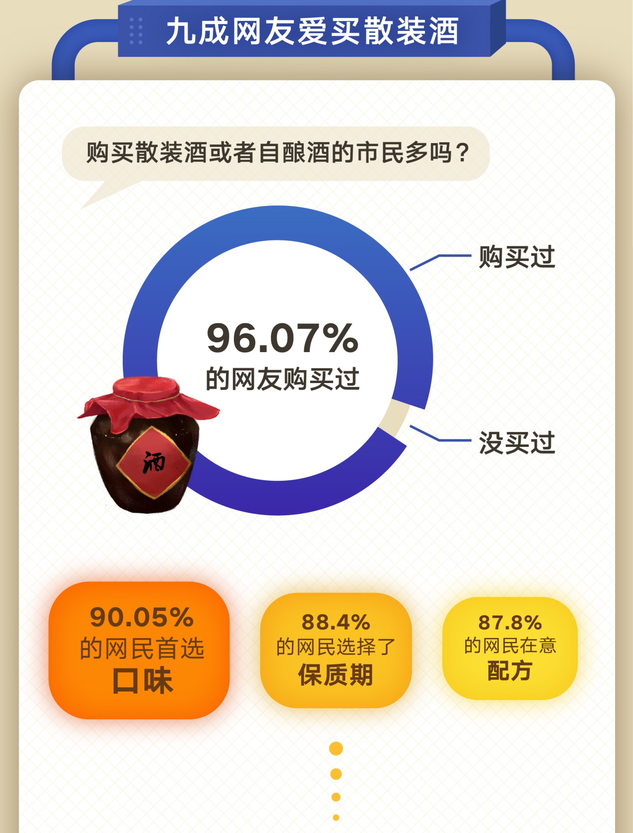 在深圳,購(gòu)買散裝酒或者自釀酒的市民多嗎?根據(jù)此次調(diào)查數(shù)據(jù)顯示,高達(dá)96.07%的網(wǎng)友都曾購(gòu)買過,可見散裝酒和自釀酒的受歡迎程度。 買散裝酒最看重什么?調(diào)查數(shù)據(jù)顯示,90.05%的網(wǎng)民首選口味;88.4%的網(wǎng)民選擇了保質(zhì)期;87.8%的網(wǎng)民在意配方,而對(duì)安全性關(guān)注的只有7.95%。