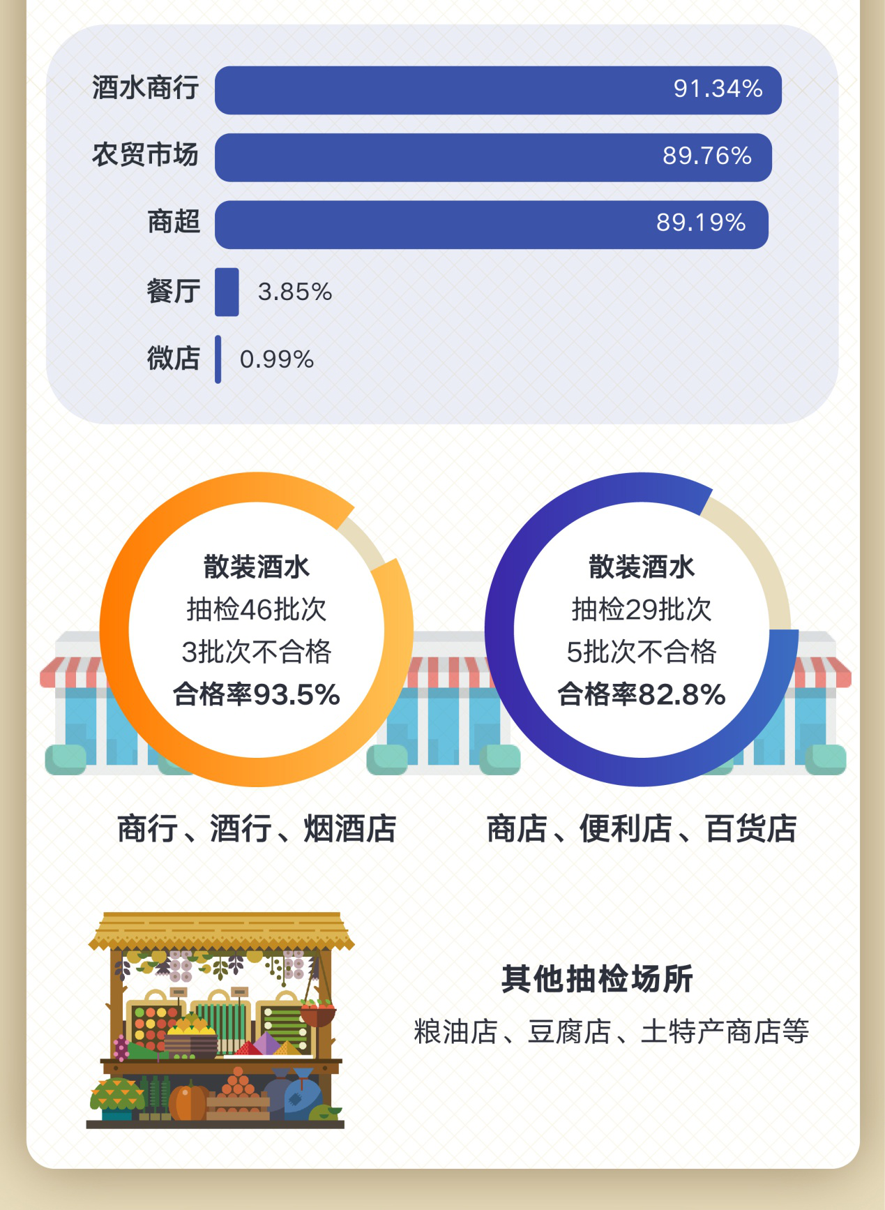 根據(jù)調(diào)查結(jié)果,此次共抽檢商行、酒行、煙酒店散裝酒水46批次,3批次不合格,合格率93.5%;抽檢商店、便利店、百貨店散裝酒29批次,5批次不合格,合格率82.8%。其他抽檢的散裝酒場所還有糧油店、豆腐店、土特產(chǎn)商店等。