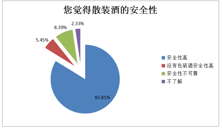 深圳人對散裝酒安全性的評價(jià)如何?83.81%的網(wǎng)民還是認(rèn)為安全性高;只有8.39%的網(wǎng)民和5.45%的網(wǎng)民認(rèn)為安全性不可靠、沒有包裝酒安全性高。