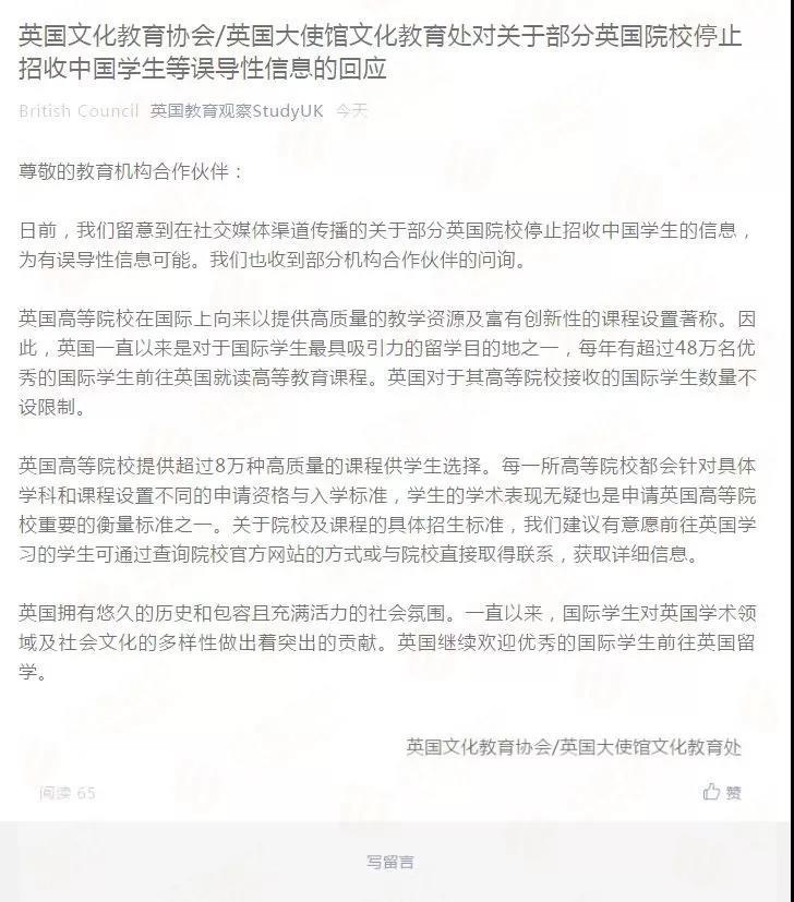 記者發(fā)現,英國文化教育協(xié)會/英國大使館文化教育處對關于部分英國院校停止招收中國學生這一信息已做出官方回應:他們留意到在社交媒體渠道傳播的關于部分英國院校停止招收中國學生的信息,為有誤導性信息可能。