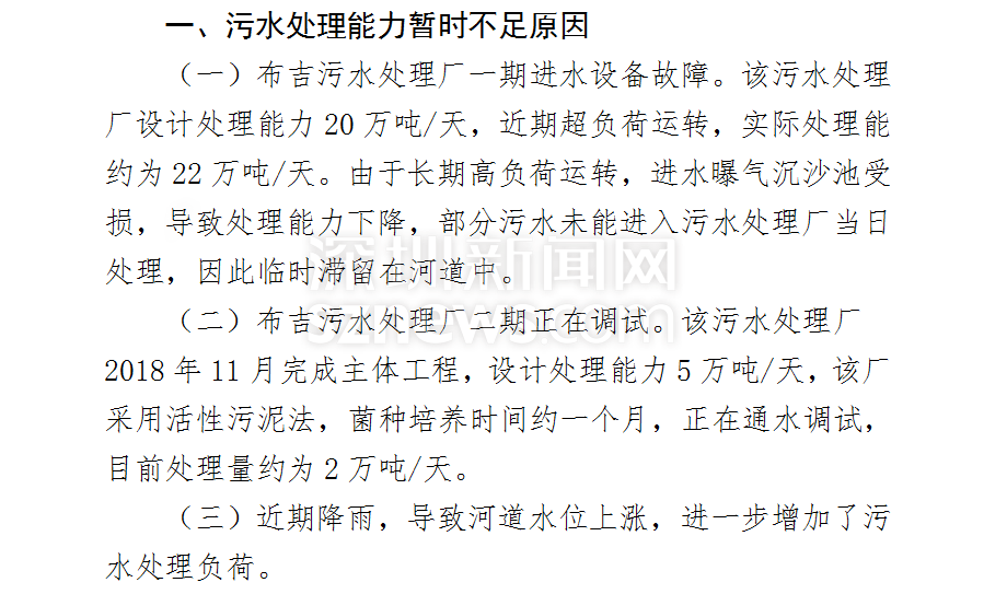 在其復函中,明確說明了河道黑臭的原因主要為該片區(qū)污水處理能力暫時不足(片區(qū)污水產生量約為26萬噸/天,目前實際污水處理量約為24萬噸/天),為防止生活污水直排下游,臨時設置橡膠壩,生活污水臨時滯留河道所致。