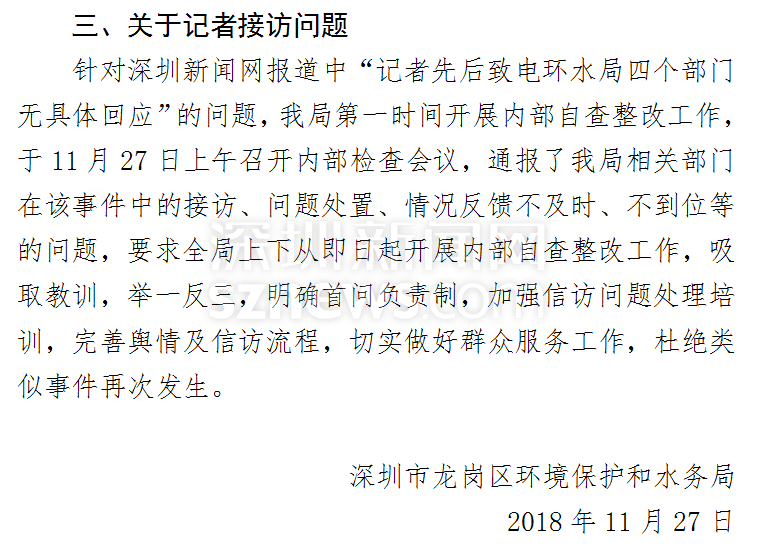 此外,對于前期報道中記者所提及的“先后致電四個部門均無具體回復”的情況,龍崗區(qū)環(huán)水局也給予了回應。他們表示將在日后的工作中完善輿情和信訪流程,切實做好群眾服務工作。