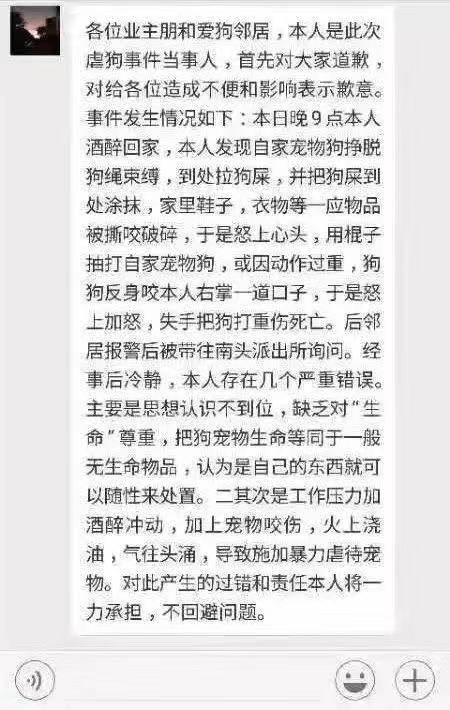 當(dāng)天深夜,男子在業(yè)主群中道歉,稱自己晚上9點(diǎn)醉酒回家,發(fā)現(xiàn)自家寵物狗掙脫狗鏈,到處拉屎還將家里的鞋子、衣物撕咬破碎,抽打自家寵物狗時(shí),又被反咬一口,才會(huì)失手將狗打成重傷,同時(shí)男子表示“對(duì)此產(chǎn)生的過(guò)錯(cuò)和責(zé)任本人將一力承擔(dān),不回避問(wèn)題。”