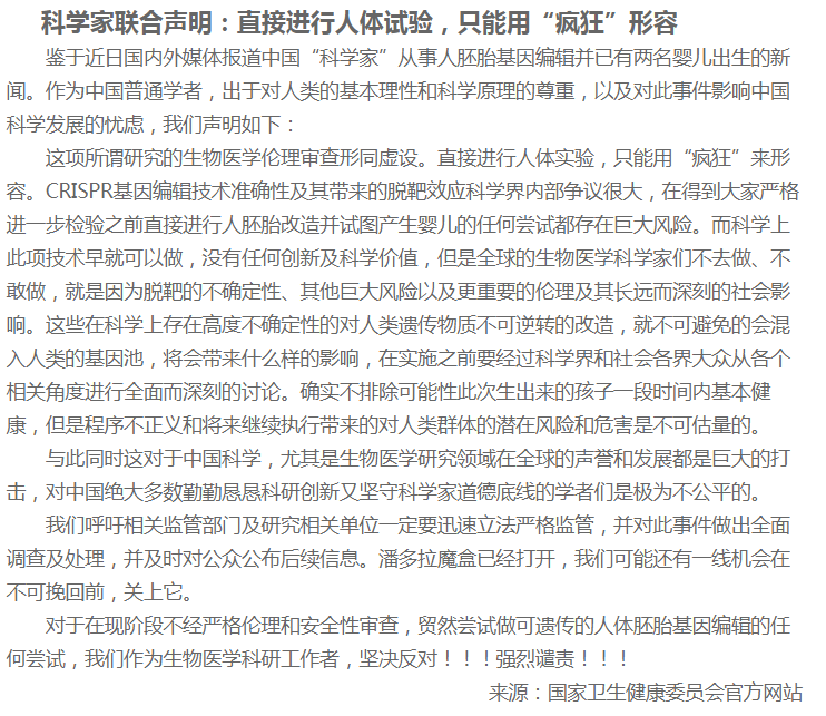 據了解,事情的起因是賀建奎在第二屆國際人類基因組編輯峰會召開前一天宣布,一對名為露露和娜娜的基因編輯嬰兒于11月在中國誕生。