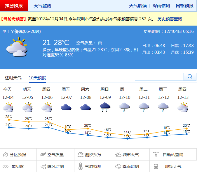 深圳新聞網(wǎng)12月4日訊(記者 劉婷)記者從市氣象臺獲悉,預(yù)計今日多云,午后云量增多,早晚有輕霧,氣溫21℃至28℃;5日至6日陰天間多云,間有零星小雨。預(yù)計7日起冷空氣活動頻繁,北風(fēng)加大,7日至8日陰天有分散小雨,氣溫下降,最低氣溫或低至14℃。