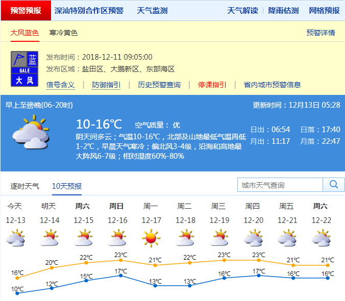 深圳新聞網(wǎng)2018年12月13日訊(記者 施冰冰)記者從深圳市氣象局獲悉,今日天氣寒冷:1多云間陰天,可見(jiàn)陽(yáng)光,沿海和高地最大陣風(fēng)6級(jí),氣溫11-17℃,北部及山地最低氣溫略低1℃,白天比12日溫暖;14-16日多云,可見(jiàn)陽(yáng)光,氣溫逐日回升;寒冷黃色預(yù)警將持續(xù)到今日,14日起氣溫回升。