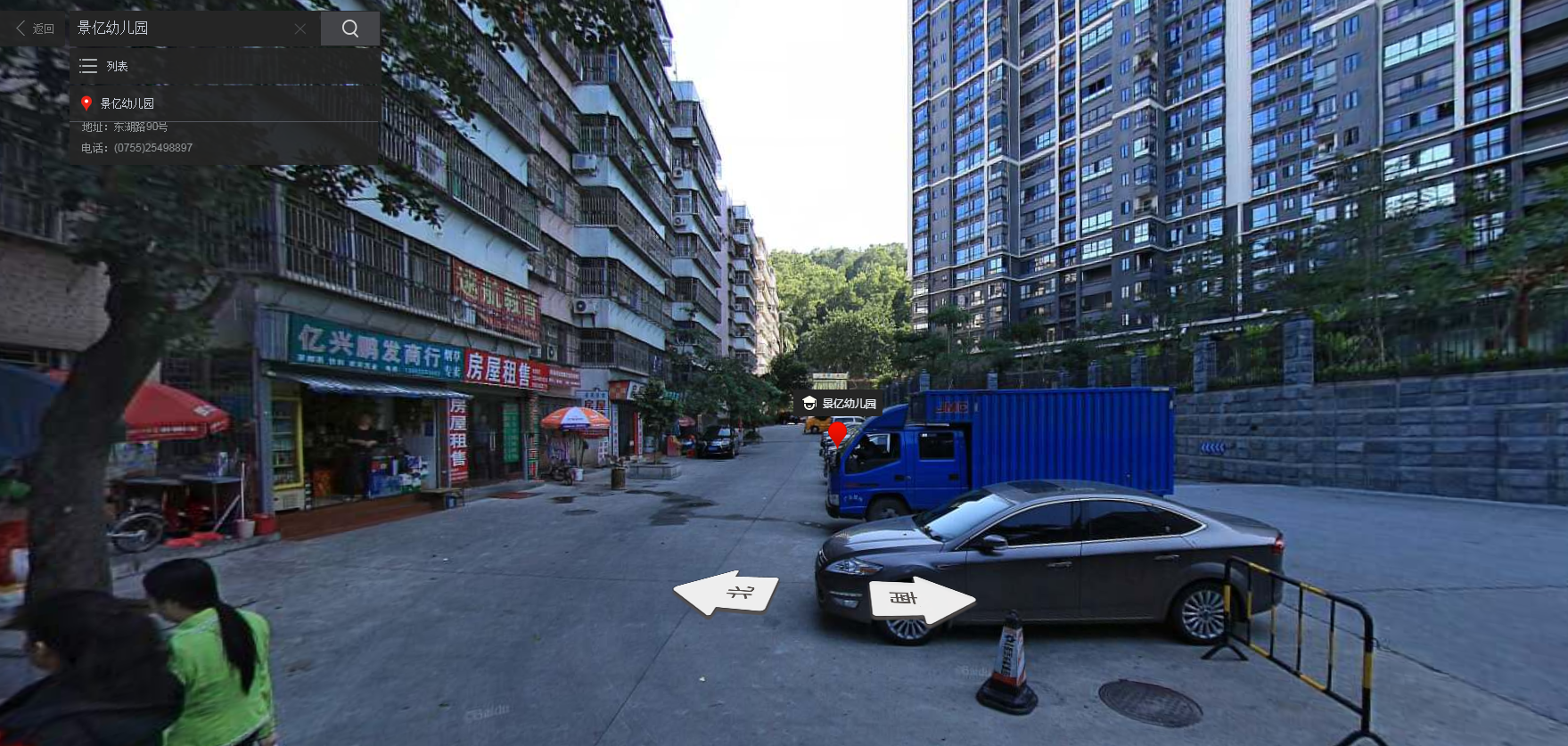 針對網(wǎng)帖的爆料內(nèi)容,記者查詢了百度全景地圖,以景億幼兒園作為第一視角,正對其大門的道路如該網(wǎng)友所言,一半以上被用來停車,而另一半則用來給行人和車輛共同通行。