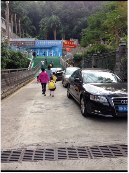 據(jù)該網(wǎng)友反映,通往景億幼兒園大門的道路只有上述提及的那兩條車道,一條被用來停車,而另一條則滿是排隊(duì)從景億山莊車庫轉(zhuǎn)彎出來的機(jī)動(dòng)車?!岸紱]有路可以走了”該網(wǎng)友在帖文中表示,小孩和來接送的家長只能從機(jī)動(dòng)車之間穿過,太不安全了。隨后,該網(wǎng)友還質(zhì)疑:事關(guān)3-5歲幼兒生命安全,為什么沒人管?
