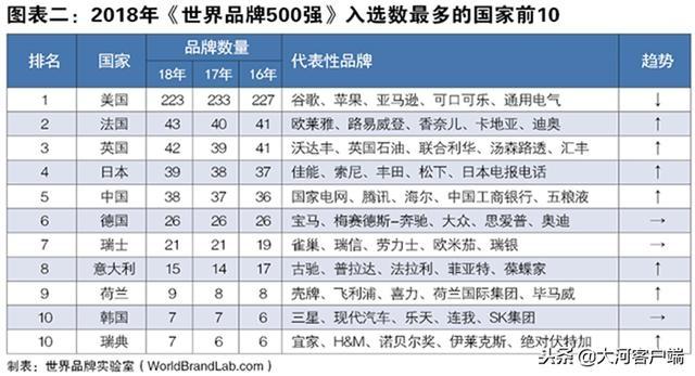 2018年《世界品牌500強(qiáng)》排行榜入選國家共計(jì)28個(gè)。從品牌數(shù)量的國家分布看,美國占據(jù)500強(qiáng)中的223席,繼續(xù)保持世界品牌第一強(qiáng)國位置;歐洲傳統(tǒng)強(qiáng)國法國和英國分別有43個(gè)和42個(gè)品牌上榜,分列二三位;日本、中國、德國、瑞士和意大利是品牌大國的第二陣營,分別有39個(gè)、38個(gè)、26個(gè)、21個(gè)和15個(gè)品牌入選。由此可見,即使歐洲經(jīng)濟(jì)低迷,但歐洲國家的超級(jí)品牌似乎依然堅(jiān)挺。中國雖然有38個(gè)品牌入選,但相對(duì)于13億人口大國和世界第二大經(jīng)濟(jì)體,中國品牌顯然還處于“第三世界”。
