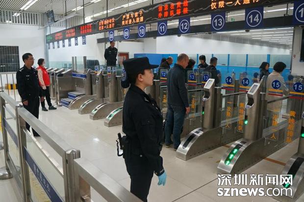 邊檢民警在皇崗口岸出境大廳自助通道區(qū)域監(jiān)護(黃俊生 陳志偉 攝)