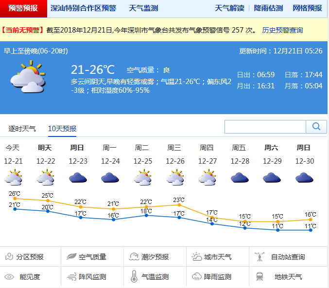 深圳市氣象局預計,21日深圳市多云間陰天為主,早晚有輕霧或霧,氣溫在20-26℃,東風2-3級,相對濕度65-85%;22日多云間陰天,早晚有輕霧,天氣溫暖空氣濕潤,氣溫在20-25℃;23-24日受弱冷空氣影響,有分散小雨,氣溫小幅下降;25-26日多云可見陽光;27日起受不斷補充的冷空氣影響,氣溫逐日下降,天氣明顯轉(zhuǎn)冷。