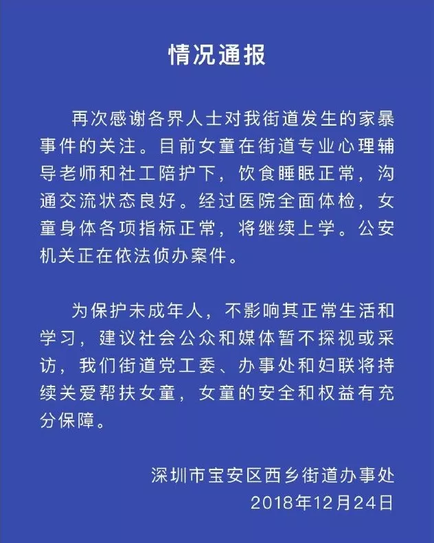 12月23日,深圳警方關(guān)注并調(diào)查此事。隨后深圳市寶安區(qū)委宣傳部官方微博@陽光寶安發(fā)布通報稱,女童父母對毆打女童的事實供認(rèn)不諱。寶安區(qū)婦聯(lián)已向法院申請女童人身安全保護令。
